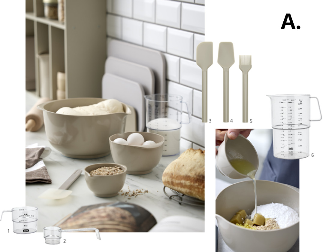Jakmile máte odměřeno, můžete se pustit do pečení s pomocí sady na pečení řady Emma. Sada obsahuje škrabku na těsto, lžíci 3 v 1 na škrábání těsta a štětec na pečení s extra dlouhou rukojetí. Všechny nástroje jsou vyrobeny z odolných, vysoce kvalitních materiálů, se kterými se pohodlně pracuje. A jsou tak jednoduché a elegantní, že je můžete nechat na stole, zatímco pokračujete v pečení.